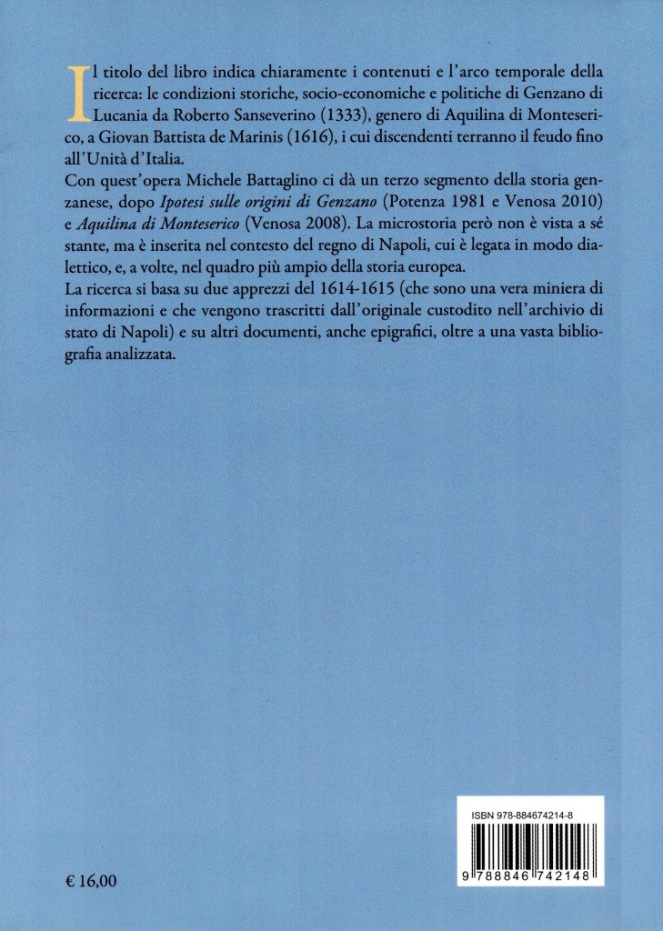 Questo libro, che è il terzo segmento di una storia genzanese scritta da Michele Battaglino, dopo Ipotesi sulle origini di Genzano (1981 e 2010) e Aquilina di Monteserico (2008), descrive le condizioni storiche, socio-economiche e politiche di Genzano da Roberto Sanseverino (1333), genero di Aquilina di Monteserico, a Giovan Battista de Marinis (1616), i cui discendenti terranno il feudo sino all’Unità d’Italia. Uno dei pregi del saggio sta nel fatto che la microstoria non è vista a sé stante, ma è inserita nel contesto del regno di Napoli, cui è legata in modo dialettico, e, a volte, nel quadro più ampio della storia europea. La ricerca si basa su due apprezzi del 1614-1615 (trascritti dall’originale custodito nell’archivio di stato di Napoli e annotati nel cap. III), su altri documenti, anche epigrafici, e su una vasta bibliografia analizzata scrupolosamente.